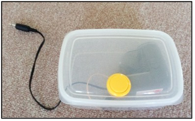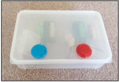 鈴ボールの音に興味をもったAさん、タッパーの黄色いスイッチをあごで押し、振動や音を感じ取ります。上体を起こして取り組むようになり、顔を動かしている様子がはっきりわかります。次に取り組んだのが、今度は赤青二つのスイッチがタッパーのふたについている教材です。片方のスイッチを押すと♪きらきら星♪、もう一方を押すとブザーが鳴ります。音の違いがきっかけになり、Aさんは二つのスイッチに気づきました。いったんは姿勢のバランスを崩しながらも、また姿勢を立て直します。二つのスイッチをあごや頬で押し分けます。だんだん手も出てくるようになり、今度は手でスイッチを押すよ、と言わんばかりでした。最初から手で教材を操作させようとしていたら、こんなふうに自然に手が出てこなかったのではないかと思います。また、この学習が自分で体を起こし、姿勢を作っていくことにもつながっていることがわかります。