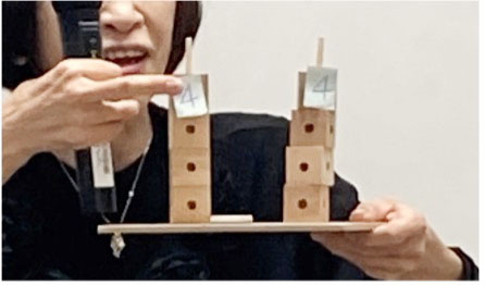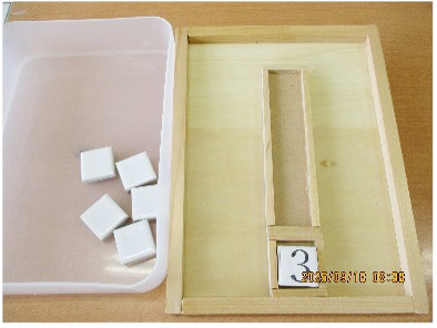 数の合成・分解を学習するプロセスの中で行った、立体のブロックで行った数の見本合わせ(レポートは円筒ブロックで行っています。)