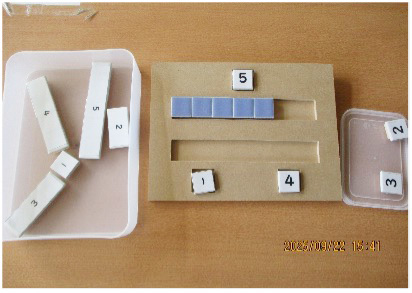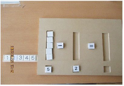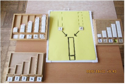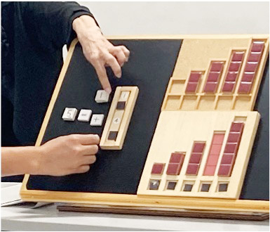 5の枠を使って、棒タイルで合成・分解を行いました。ポイントは、5を作るための二つの数を、1~5の系列板から選んで系列板に戻すことです。選んだり、戻したりするときに、枠があるか無いかで、学習の意味がはっきりしてきます。