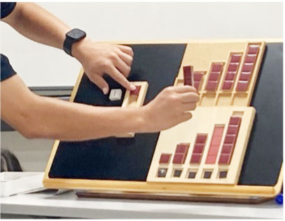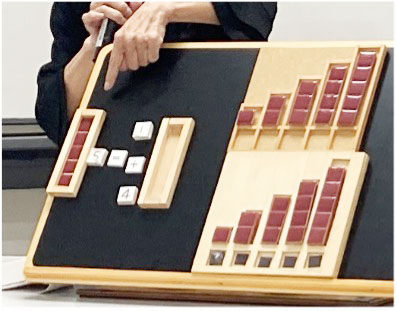 そこで、系列板を二つ用意して、「5」を作る「2」と「3」を、それぞれの系列板から持ってくるようにしました。「2」をとったあとに空の「2の枠」、「3」をとったあとに空の「3の枠」だけが残ります。そして、合成された「5」を、今度は分解して元の2と3の枠に戻します。戻る場所ができたことで、Bさんはピンときてこの課題ができるようになりました。それを見た先生も“系列板、恐るべし!”と驚いていました。