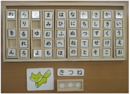 Bさんは、横書き見本の「きつね」では、「ね・つ・き」と並べたり「つ・き・ね」の順番に文字を拾ったりしていましたが、縦書き見本にしたら「き・つ・ね」の順番に文字を拾って並べることができ、発声することもできました。単語としてまとめて捉えることができたようです。