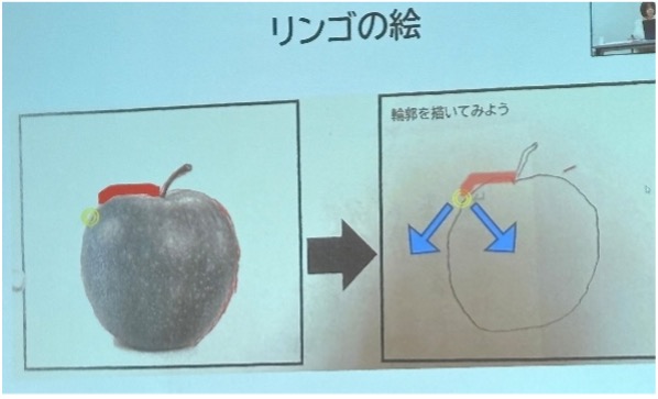 ちなみに、描画については、このリンゴの課題のように輪郭線という「形」から入る場合もありますが、リンゴの「色」に着目して部分から点描を重ねて形を捉えていく方法もあります。